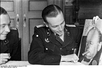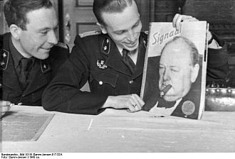 Give that man a cigar! Two Belgian-Flemish members of the Vlaamsche Wacht having fun with the Churchill cover of the Dutch issue number 8/1943.