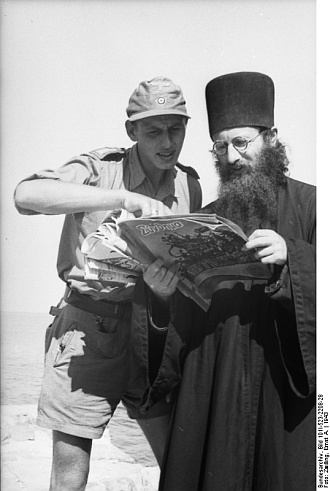 PK-Aufnahme: Sdf. Zwilling, Lw.KBA Südost. Date: August 1, 1943. Accompanying original text: "In der Mönchsrepublik Athos. Das 'Signal' in griechischer Ausgabe erweckt große Freude." (BArch, Bildbegleitzettel zu Bild 101 I (Propagandakompanien), Bd. 448-532, Filme 2101-2727, April 1943-August 1944). | |  |